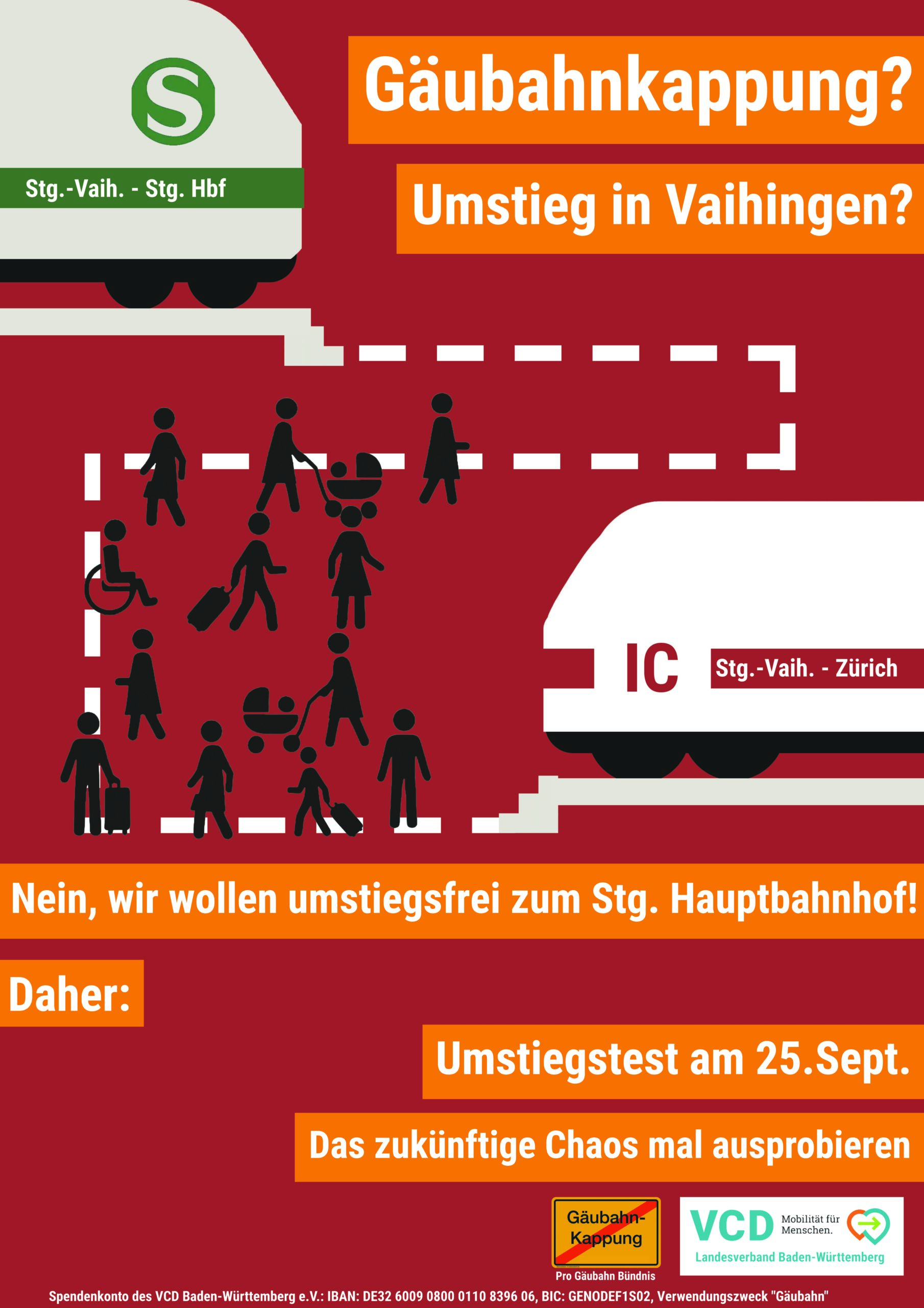 Die Gäubahn soll ab März 2027 abgehängt werden. Die Gäubahn-Züge würden dann nicht mehr bis Stuttgart Hbf durchfahren, sondern in Stuttgart-Vaihingen enden. Hier müsste dann ein kompletter IC/RE auf eine sowieso schon volle S-Bahn umsteigen. Um zu zeigen, wie wenig fahrgastfreundlich und umständlich das ist, veranstaltet das Pro Gäubahn Landesbündnis zusammen mit dem ökologisch orientierten Verkehrsclub Deutschland…
