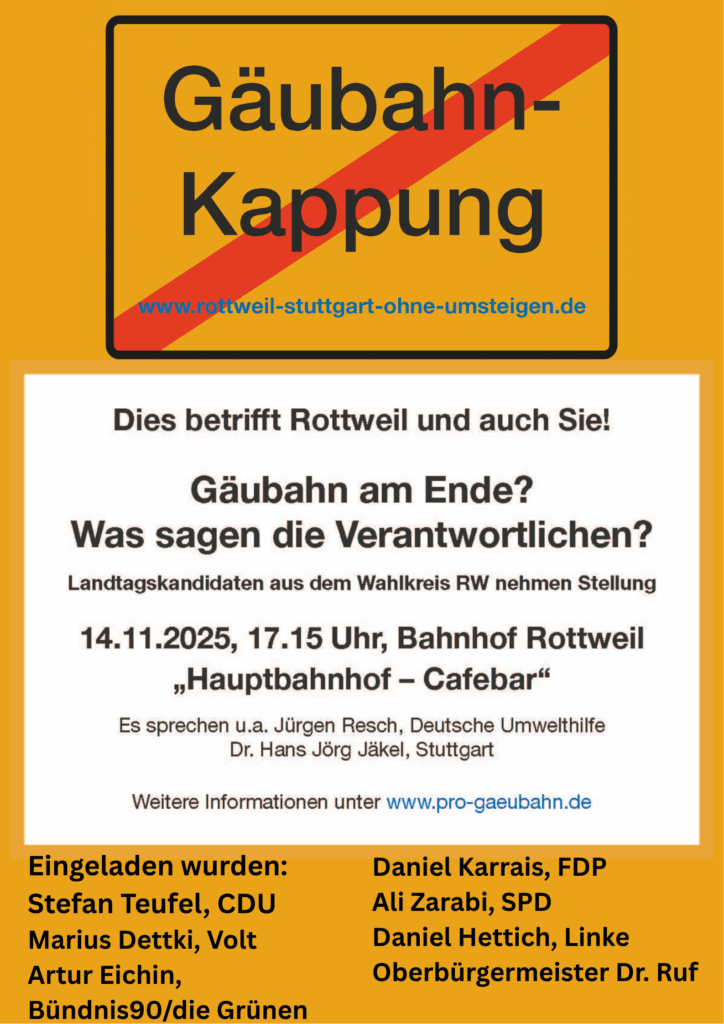 Die Kandidierenden zur Landtagswahl sind dazu eingeladen um Stellung zu nehmen; anwesend sind der Bundesvorsitzenden der Deutschen Umwelthilfe Jürgen Resch , Vertreter der örtlichen ProGäubahn Initiativen und Dr. Hans Jörg Jäckel, Pro-Gäubahn-Kommitee Stuttgart.